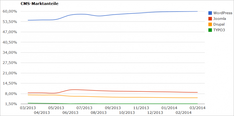 WordPress ist momentan das populärste Redaktionssystem. Die Software beherrscht nahezu zwei Drittel des CMS-Marktes und jede fünfte Website weltweit wird mit diesem System betrieben. Schaut man sich die Statistik der letzten zwölf Monate an, dann bemerkt man auch, dass lediglich WordPress nennenswerte Zuwächse verzeichnen kann. Andere Redaktionssysteme stagnieren oder verlieren sogar ihre Anteile.
