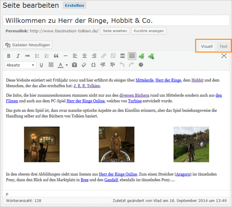 WordPress erleichtert die Arbeit eines Autors bzw. Redakteurs sehr. In WP findet man zwei Editoren. Hinter „visuell“ findet man einen sog. WYSIWYG-Editor. Dieser stellt die Inhalte so dar, wie sie nachher auch auf der Website erscheinen sollen. Wenn man „Text“ anklickt, dann kann man bei Bedarf auch in einem Text-Editor arbeiten und u.a. auch HTML-Tags oder Inline-CSS eintragen.