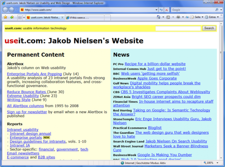 Lesenswerter Inhalt, die Seite wird schnell geladen, ist leicht zu navigieren, und man kann sie in jedem Browser ohne Probleme betrachten. Der Schwerpunkt liegt in der schnellen Verfügbarkeit bestimmter Informationen und die Gestaltung hat sich diesem Ziel völlig untergeordnet: form follows function.