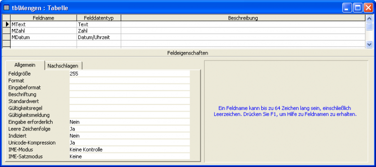 Für dieses Beispiel benötigen Sie in einer Access-Datenbank eine Tabelle tblMengen mit den Feldern wie im folgenden Bild: