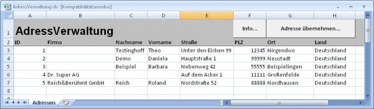 Mit dieser Technik lassen sich auch nachträglich Adressen in vorhandene Excel-Dateien einfügen oder solche benutzen, die keinen entsprechenden Bereichsnamen Adresse besitzen.