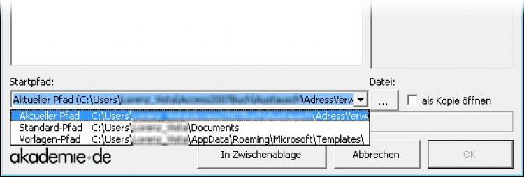 Als zweiten Schritt müssen Sie angeben, in welche Datei Sie die Adresse übernehmen wollen. Für den DateiÖffnen-Dialog stehen drei Pfade zur Verfügung, die Sie im Kombinationsfeld Startpfad auswählen: