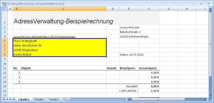Die Dateien AV_BeispielLeer.xls und AV_BeispielRechnung.xlt sind für die Funktion nicht nötig, sie sind lediglich zum schnellen Testen gedacht. Sinnvollerweise kopieren Sie AV_BeispielRechnung.xlt dazu in das Verzeichnis, welches Ihnen vom hier anschließend vorgestellten AdresseÜbernehmen-Dialog als Vorlagen-Pfad angezeigt wird.