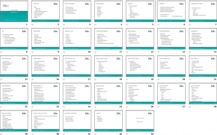 Ich finde, diese Folien lassen sich besser gestalten, indem Sie eine größere Schrift verwenden. Diese Präsentation hatte für mich zu wenig neue Informationen enthalten. Ich möchte Sie bitten, etwas langsamer zu reden, damit ich mir Notizen machen kann.