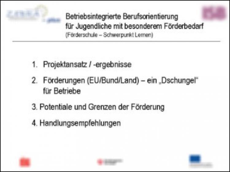 Es geht schon gleich am Anfang los mit der Überschrift. Wie heißt Ihr Vortrag? Da gibt es Titel, die jede Doktorarbeit das Fürchten lehren: "Betriebsintegrierte Berufsorientierung als Grundlage für betriebliche Berufsvorbereitung - Perspektive betriebliche Berufsausbildung". Drei Mal "Betrieb" und noch drei Mal "Beruf" in einem einzigen Thema, das ist schon wegweisend!