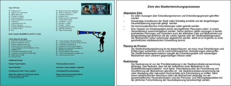 Daraus folgt zwingend, dass die Folien nicht nur möglichst kurze Texte, sondern vor allem Bilder enthalten müssen. Bilder werden von den Zuschauern tatsächlich nicht nur vom Auge erfasst, sondern vor allem in einem anderen Bereich des Gehirns verarbeitet. Bilder sprechen die visuelle Verarbeitung und praktisch immer auch die Gefühlsebene (beides in der rechten Gehirnhälfte) an, während Texte eher links analysiert werden. Damit ist eine quasi parallele Aufnahme möglich.