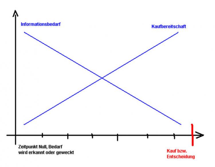 Dargestellt wird ein Kaufprozess im Zeitablauf. Nach Erkennung des Bedarfs sinkt der anfänglich sehr hohe Informationsbedarf immer weiter ab, die Kaufbereitschaft für ein bestimmtes Produkt steigt dagegen immer weiter an. Wenn der Informationsbedarf vollständig befriedigt ist, wird der Kauf getätigt, bzw. die Entscheidung für einen Anbieter getroffen.