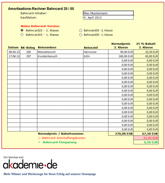 Unseren Bahncard-Vorteilsrechner können zahlende Mitglieder von akademie.de als Excel-Datei hier herunterladen: Download Bahncard-Vorteilsrechner.xls