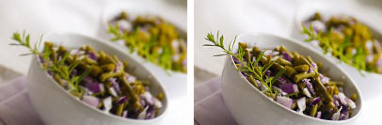 Betrachten Sie die beiden Bilder: Das Motiv ist zwar bei beiden erkennbar, dennoch ist das linke einfach völlig unscharf und verwackelt. Angenommen, Sie sehen es als Besucher beispielsweise der Web-Site eines Partyservice. Würde Sie dieses Bild dazu animieren, den Partyservice zu testen? Das rechte Foto hingegen ist schön scharf, der Salat wirkt farbig, frisch und lecker.