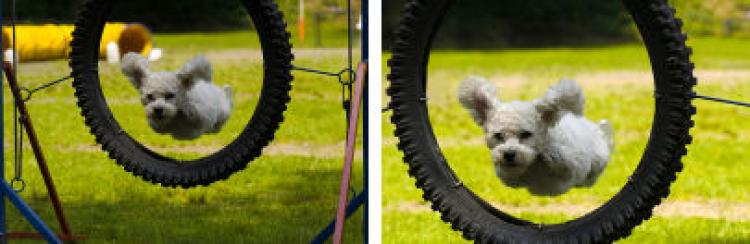 Folgender Vergleich zeigt das. Beide Bilder stellen den gleichen springenden Hund dar. Das rechte Bild ist ein bearbeiteter Ausschnitt des ersten. Wenn Sie beide Bilder in 200 Pixel Breite betrachten, wird deutlich, dass im linken Bild viel zu viele Details vom Hauptmotiv ablenken, wie der gelbe Tunnel im Hintergrund, das Gestänge für die Aufhängung des Reifens, der Schatten im Vordergrund, die rote Stange hinten rechts. Das alles macht das Bild sehr unruhig, man achtet gar nicht auf das Motiv "fliegender Hund". Im rechten Bild wurde der Ausschnitt so gewählt, dass große Teile dieser unruhigen Umgebung verschwinden, der Rest wurde retuschiert. Das Ergebnis ist ein Bild, bei dem sich das Auge automatisch auf das Hauptmotiv richtet und bei dem auch in kleineren Anzeigegrößen das Motiv noch gut zu erkennen ist.