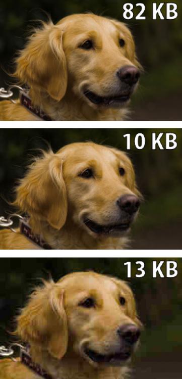 Folgendes Beispiel zeigt dies. Das obere Bild ist das JPG-Bild in bestmöglicher Qualität, das mittlere mit 20% Komprimierung also 80% Qualität und das untere mit 50% Komprimierung. Beim Mittleren lässt sich erkennen, dass feine Details der Haare fehlen, das Fell wirkt deutlich flächiger als im Original. Beim unteren sind deutliche Artefakte von der Komprimierung zu erkennen, nämlich die großen quadratischen Bereiche, die sich durch das ganze Bild ziehen. So stark komprimierte Grafiken sehen wirklich unprofessionell aus und sind zudem meist noch größer als weniger komprimiertes Bild. Das lässt sich auch hier erkennen, denn das untere Bild ist 3 KB größer als das mittlere mit der besseren Qualität. Dieses Phänomen tritt vor allem bei Bildern auf, die große Flächen ähnlicher Farben, wie hier der Hintergrund habe, denn durch die Art der JPG-Komprimierung bilden sich dann quadratische und Rechteckige Artefakte die mehr Speicher benötigen also der ehemals ruhige Hintergrund.
