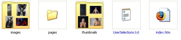Dieser Webseitengenerator erzeugt eine Indexdatei mit der Bildübersicht sowie Unterordner für die Galeriebilder, Vorschaubilder und die einzelnen Seiten. In der Datei 'UserSelections' sind die Angaben darüber gespeichert, welche Farben und Formate für das Seitendesign ausgewählt wurden.