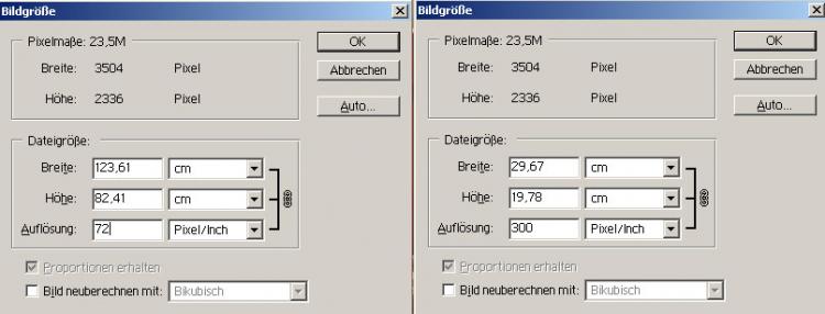 Die Bildgrößen-Angaben zeigen anschaulich, wie unterschiedlich die Bildmaße bei unterschiedlichen dpi-Werten ausfallen.