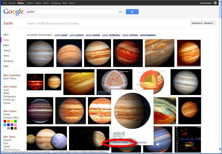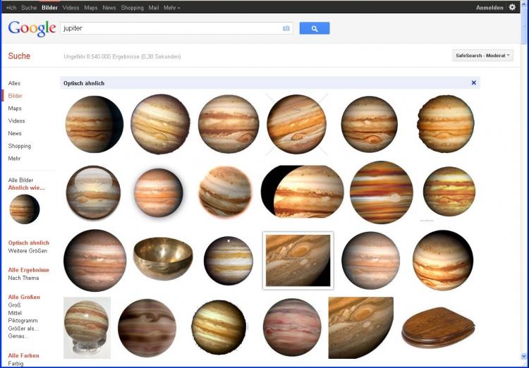 Google ist ohne die neuen Funktionen auch schon sehr effektiv im Auffinden von Bildern. Angenommen, Sie suchen nach einer schönen Illustration vom Planeten Jupiter, dann würden Sie das bei der Google-Bildersuche als Wort eingeben: