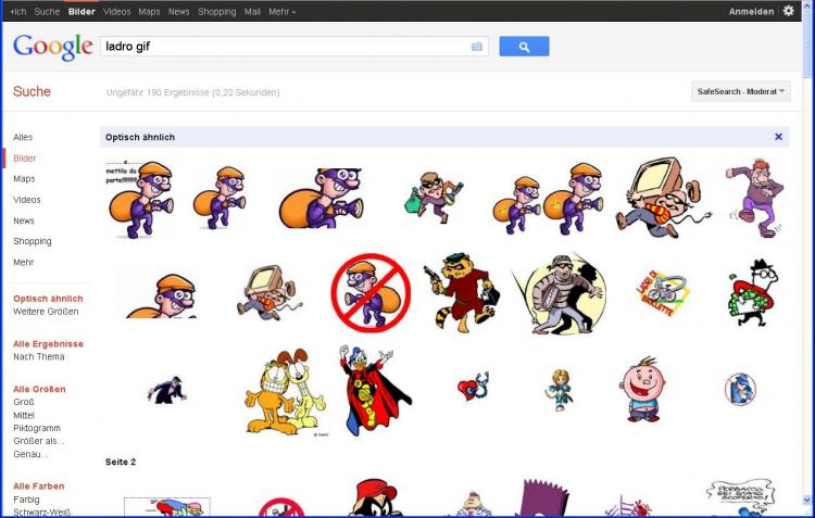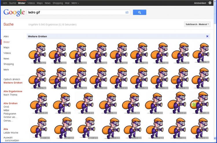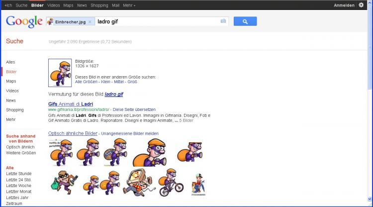 Anschließend finden Sie nicht nur Ihr Bild verkleinert in der Eingabezeile der Bildersuche, sondern zusätzlich auch eine Vermutung von Google, um was für ein Bild es sich handelt. Obwohl ich es als "Einbrecher.jpg" gespeichert hatte, vermutet Google einen italienischen Dieb ("ladro") und ein GIF-Format als ursprüngliche Quelle.