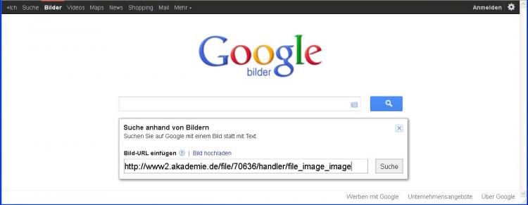 Nach Klick auf die hellblaue Kamera in der Google-Bildersuche fügen Sie dort die Bild-URL aus der Zwischenablage ein und lassen das Bild suchen: