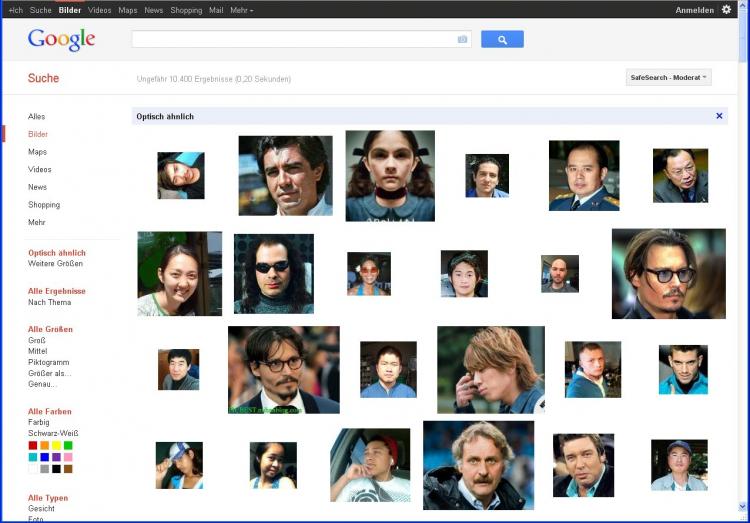 Wenn ich dann allerdings auf optisch ähnliche Bilder wechsle, bin ich allzu früh geschmeichelt, dass ich Johnny Depp ähneln soll. Tatsächlich passt aber nur der Blauton meines Hemdes zu seinem Jacket bzw. den blau getönten Brillengläsern sowie entsprechend zu allen hellblauen Elementen in den übrigen Fotos. Schade.