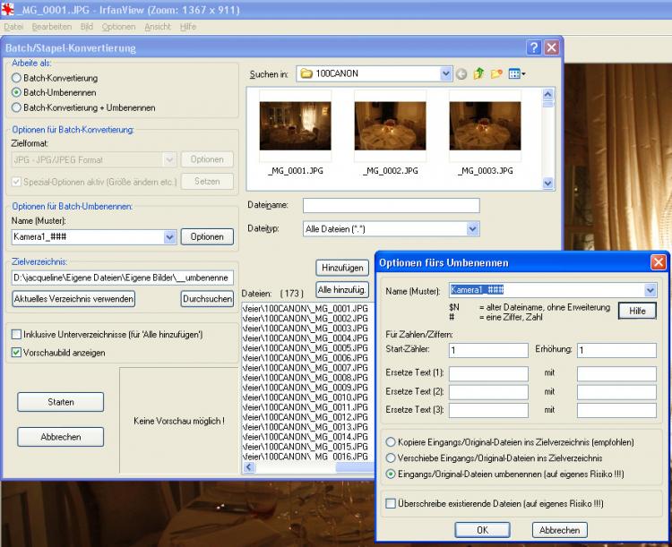 Wir haben für das folgende Beispiel mit dem Gratis-Programm IrfanView eine Grafiksoftware für das "Stapel-Umbenennen" benutzt. Wie es damit geht, wird im Leitfaden Bildbearbeitung mit IrfanView im Kapitel "Stapelverarbeitung" genau erklärt. Viele andere Foto-Verwaltungsprogramm bieten ebenfalls eine ähnliche Funktion, z. B. Picasa.