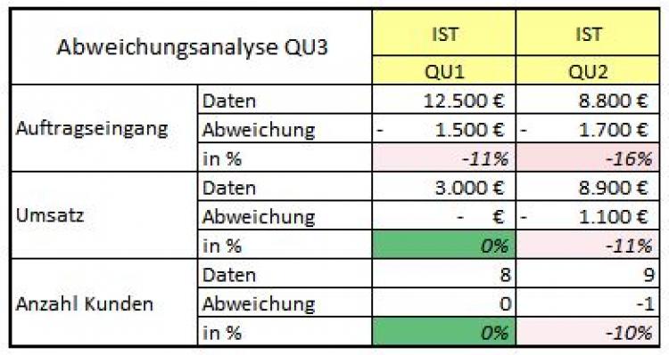 Spätestens zum Ende des nächsten Quartals können Sie anhand der Abweichungsanalyse-Datei an den Zahlen sehen, ob Sie mit Ihren Maßnahmen erfolgreich waren und die Ergebnisse sich entsprechend entwickelt haben.