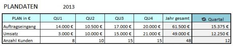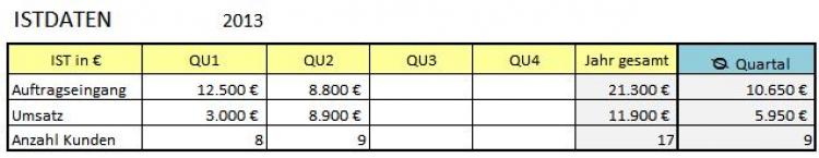Dazu ergänzen Sie das laufende Jahr 2013 mit den Planwerten der noch folgenden zwei Quartale: Damit ergibt sich ein voraussichtliches Jahresergebnis. Nun sehen Sie, wie das erste Jahr verlaufen kann, wenn der Plan für die nächsten Quartale noch eingehalten wird.