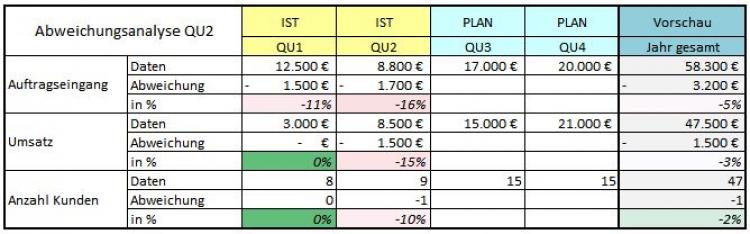 Spätestens zum Ende des nächsten Quartals können Sie anhand der Abweichungsanalyse-Datei an den Zahlen sehen, ob Sie mit Ihren Maßnahmen erfolgreich waren und die Ergebnisse sich entsprechend entwickelt haben.