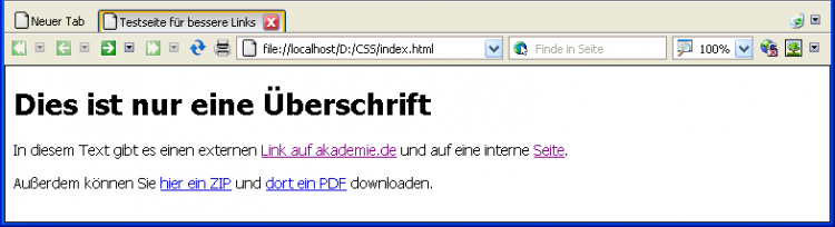 In diesem Text gibt es einen externen <a href="http://www.akademie.de">Link auf akademie.de</a> und auf eine interne <a href="intern.html">Seite</a>.