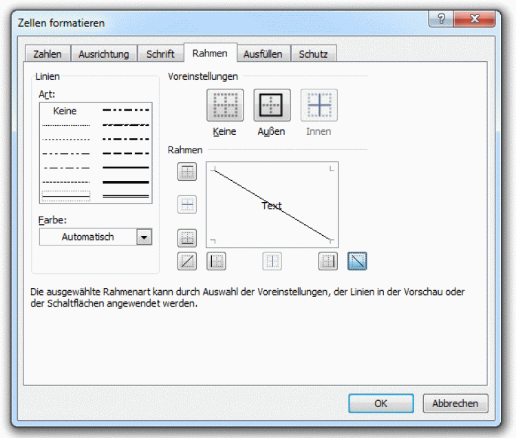 Schräge Linien erzeugen Sie über das Register 'Rahmen'.
