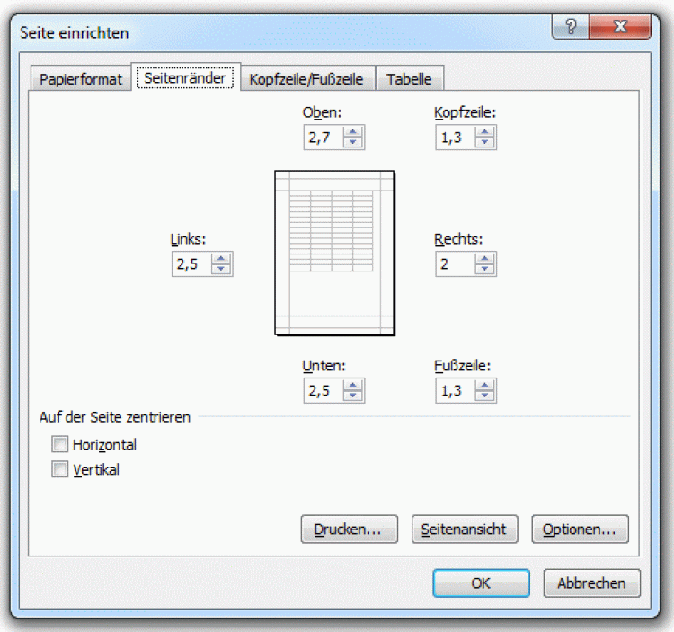 Im unteren Bereich des Fensters finden Sie den Bereich Auf der Seite zentrieren. Dort müssen Sie lediglich die Kontrollkästchen Horizontal und Vertikal abhaken. Bestätigen Sie Ihre Angaben durch einen Klick auf die Schaltfläche OK und schon erscheint die Tabelle beim Ausdruck exakt in der Mitte des Blattes.