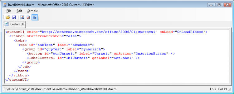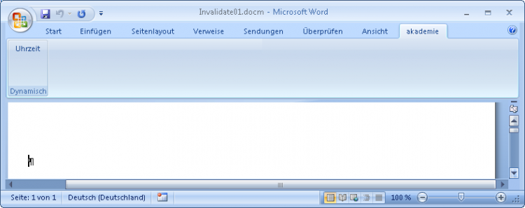 Hier ist das anders, denn die OnRibbonLoad-Prozedur kann nur beim Öffnen der Datei ausgeführt werden, die Datei ist aber schon offen. Damit steht die m_ribAkademie-Variable auf Nothing. Es bleibt Ihnen nichts anderes übrig, als das Dokument zu schließen und wieder zu öffnen.