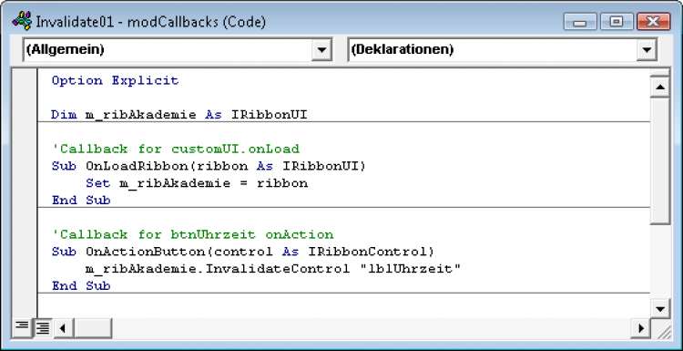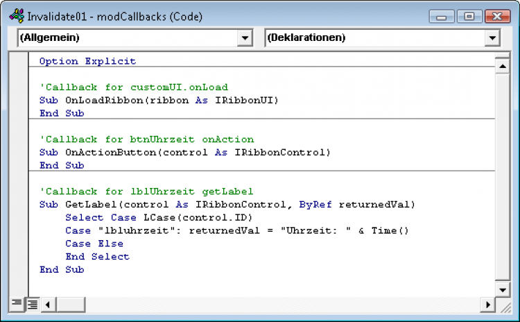 Option Explicit 'Callback for customUI onLoad Sub OnLoadRibbon(ribbon As IRibbonUI) End Sub 'Callback for btnUhrzeit onAction Sub OnActionButton(control As IRibbonControl) End Sub 'Callback for lblUhrzeit getLabel Sub GetLabel(control As IRibbonControl, ByRef returnedVal) End Sub