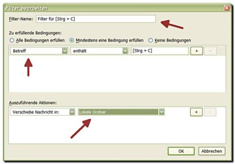 Lassen Sie im mittleren Feld das vorausgefüllte "enthält" stehen und fügen Sie nun den Inhalt der Zwischenablage im dritten Feld der Zeile ein. Nun noch den Zielordner im unteren Teil ausgewählt, mit OK bestätigt und schon ist auch diese Regel fertig.