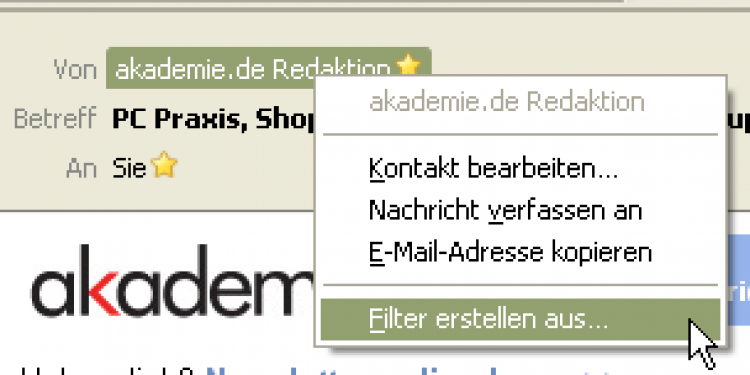 Zunächst legen Sie - falls noch nicht vorhanden - den Ordner an, den die automatische Regel später bedienen soll. Dann markieren Sie die mit der Regel zu bearbeitende E-Mail. Möchten Sie den Filter auf Basis der Absender- oder Empfängeradresse erstellen, dann können Sie diese Option direkt über einen Rechtsklick auf die jeweilige Adresse im Anzeigeteil aufrufen: