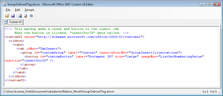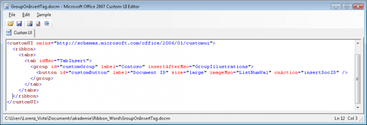 <customUI xmlns="http://schemas.microsoft.com/office/2006/01/customui"> <ribbon> <tabs> <tab idMso="TabInsert"> <group id="customGroup" label="Contoso" insertAfterMso="GroupInsertIllustrations"> <button id="customButton" label="Document ID" size="large" imageMso="ListSetNumberingValue" onAction="insertDocID" /> </group> </tab> </tabs> </ribbon> </customUI>