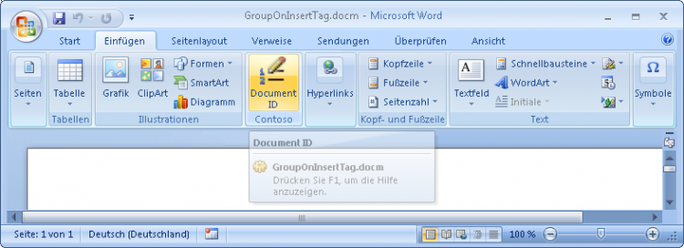 Fügen Sie mit dem Menü Sample/Word - Group On Insert Tab den folgenden Beispiel-Code ein: