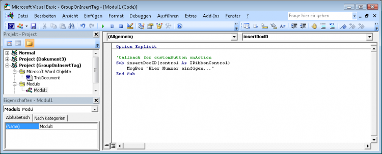 'callback for customButton onAction Sub insertDocID(control As IRibbonControl) MsgBox "hier Nummer einfügen..." End Sub