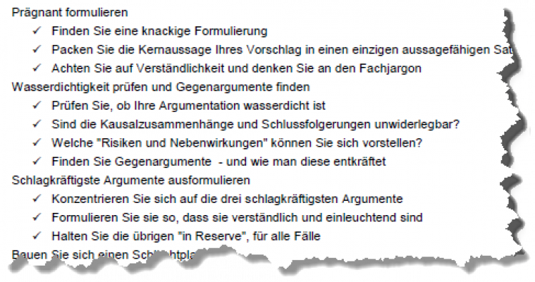 Unseren Mitgliedern stellen wir eine zweiseitige Checkliste zur Verfügung: "Professionell argumentieren" (PDF, 113 kB).