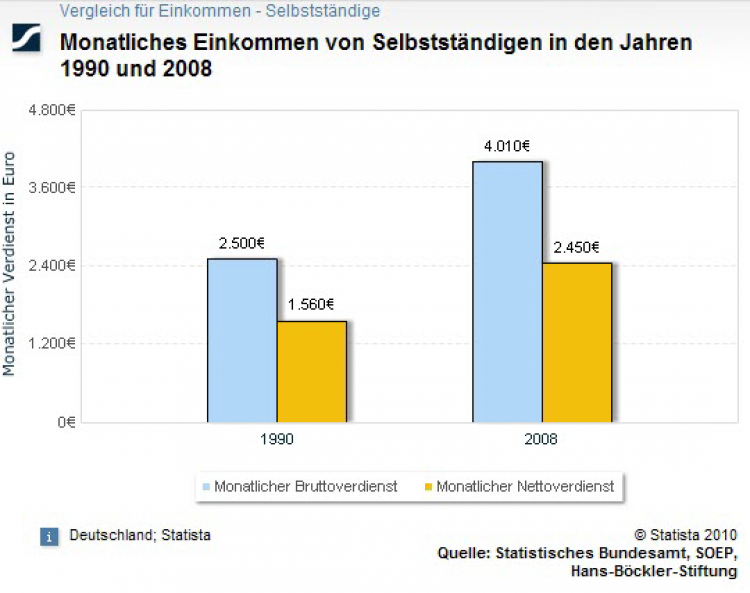 Glaubt man dem Statistikportal "Statista", so ist der durchschnittliche Bruttoverdienst (!) von Selbstständigen in den letzten 20 Jahren zwar von 2.500 Euro auf über 4.000 Euro gestiegen. In diesen Durchschnittswert gehen aber auch die gut verdienende Ärzte, Anwälte, Steuer- und Unternehmensberater ein - in Wirklichkeit sind nur die allerwenigsten Selbstständigen vom Spitzensteuersatz oder gar der Reichensteuer bedroht: