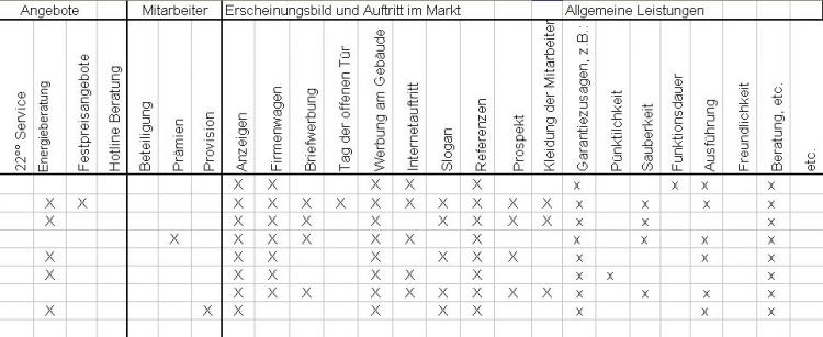 Die Grafik zeigt eine Matrix, in der die Leistungen aller wichtigen Wettbewerber erfasst worden sind. Sie zeigt auf, dass es in den Leistungsfeldern Angebot, Mitarbeiter und Service Maßnahmen gibt, die noch von keinem der Wettbewerber eingesetzt werden. Jetzt kann - am besten gemeinsam mit wichtigen Kunden - überlegt werden, welche Leistungen neu in das eigene Angebot aufgenommen werden sollen. Bei diesen Überlegungen sind folgende Fragen zu beantworten: