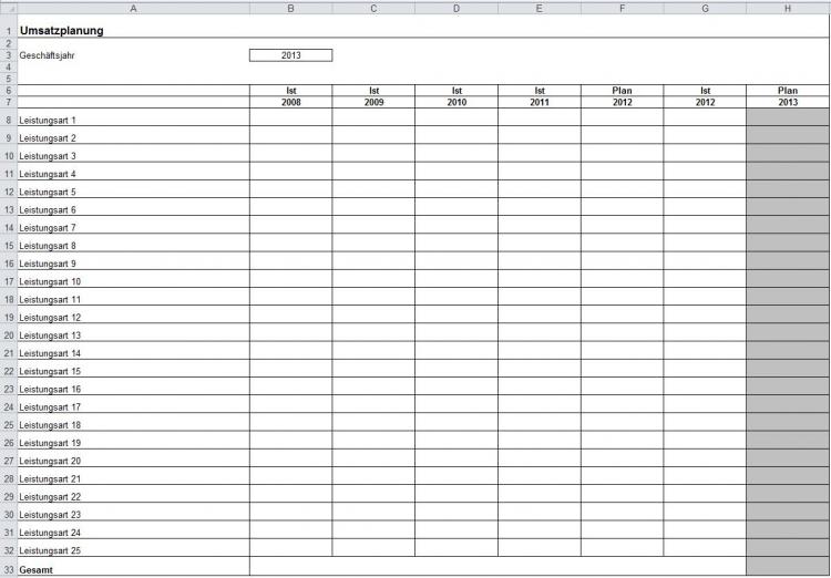 Falls Sie keine Produkte zu einem festgelegten Preis verkaufen, sondern Leistungen, die jeweils unterschiedlich berechnet werden, können Sie die Umsätze direkt planen. Auch hier empfiehlt es sich, die Umsätze und Plandaten der Vergangenheit heranzuziehen und ein übersichtliches Schema einzusetzen. Eine entsprechende Arbeitshilfe finden Sie in unserer Datei Planungstool_3.xls in der Tabelle Umsatzplanung.xls.
