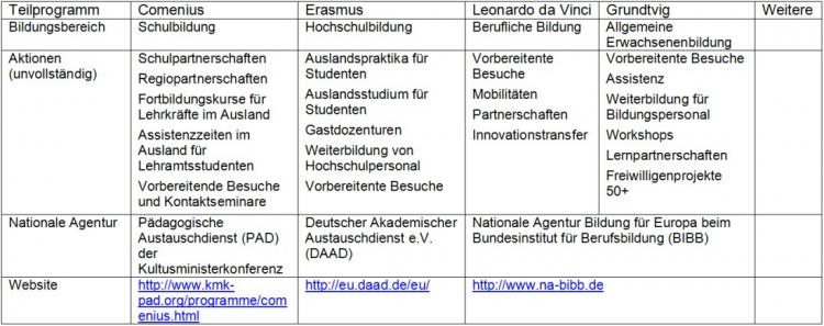 Daneben beinhaltet das Programm für lebenslanges Lernen ein Querschnittsprogramm und Aktionen. Sie finden eine vollständige Übersicht unter lebenslanges-lernen.eu und den weiterführenden Links.