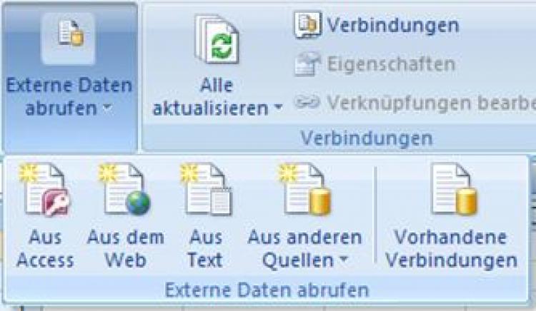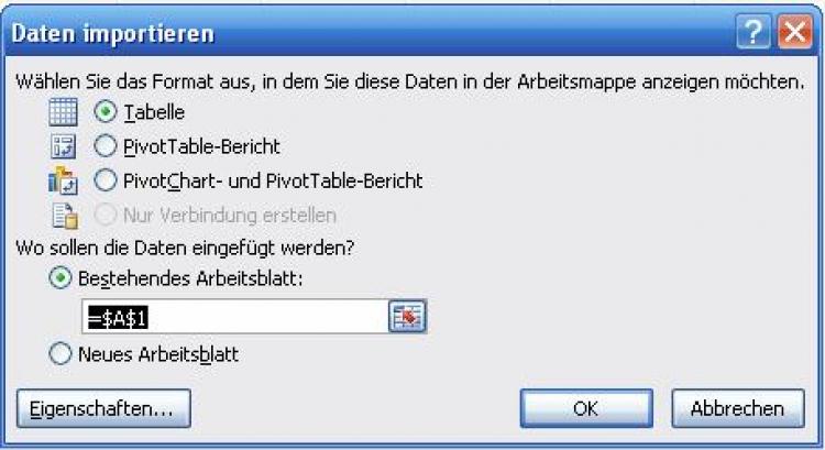 Auch Tabellen in Form von Textdateien (*.txt), deren einzelne Daten eines Satzes mit bestimmten Trennzeichen, z.B Semikola oder Kommata, voneinander getrennt sind und jeder Datensatz mit Absatzendezeichen endet, lassen sich importieren. Dazu wählen Sie nur "Daten" - "Externe Daten abrufen" - "Aus Text."