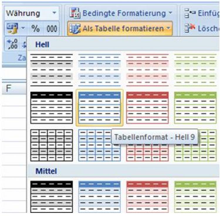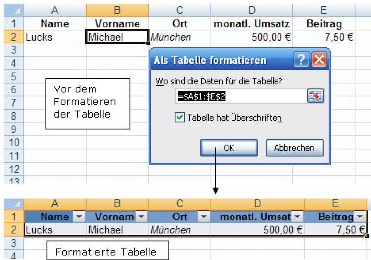 Die gesamte Tabelle erhält die ausgewählten Zellformate und neben den einzelnen Überschriften werden Pulldown-Listenpfeile (für die Autofilter!) angezeigt.