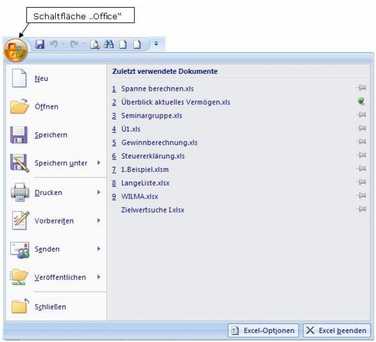 Zentraler Punkt zum Öffnen, Speichern, Drucken usw. ist das Befehlsangebot der neuen Schaltfläche "Office". Klicken Sie darauf, um die neue Auswahl anzuzeigen.