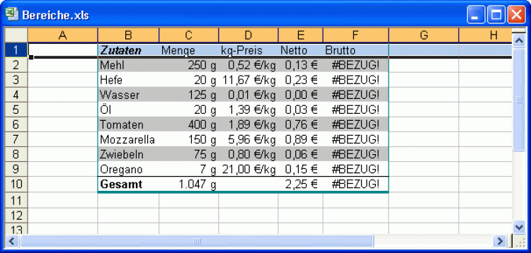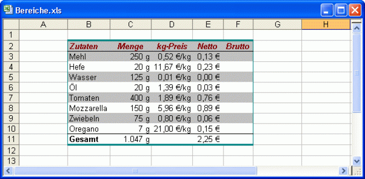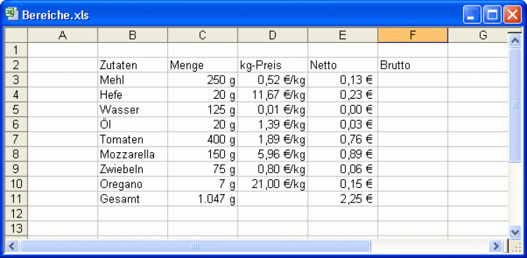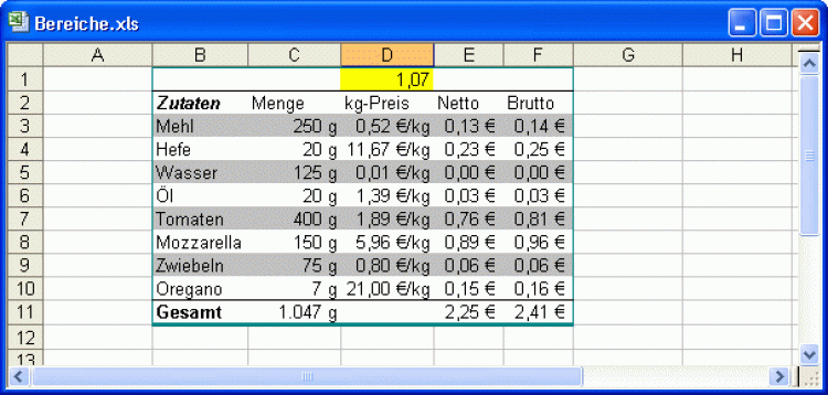Angenommen, Sie haben in Excel eine ganz typische Kalkulation erstellt, in unserem Beispiel für eine Pizza, deren Preis Sie anhand der Zutaten ermitteln wollen. Das sähe beispielsweise so aus: