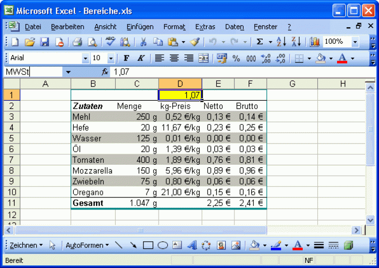 Die Formel für den Brutto-Wert lautet dann beispielsweise für die Zelle $F$3: