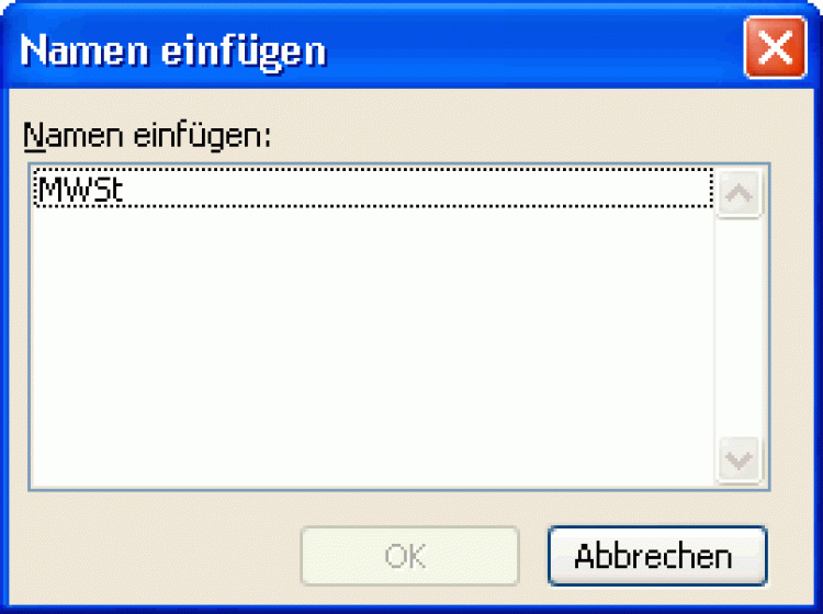 Da ein solcher Bereichsname bedeutend länger sein kann, sollten Sie Schreibfehlern vorbeugen, indem Sie sich alle Bereichsnamen mittels F3-Taste als Dialog zur Auswahl präsentieren lassen: