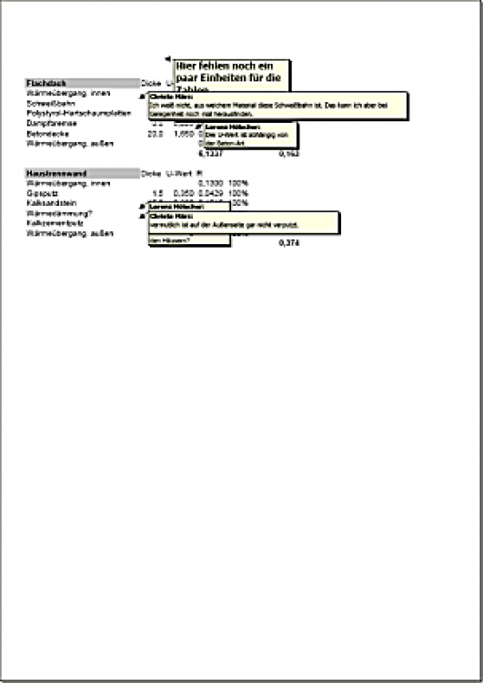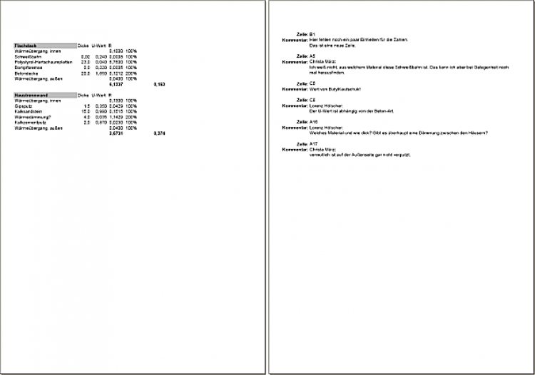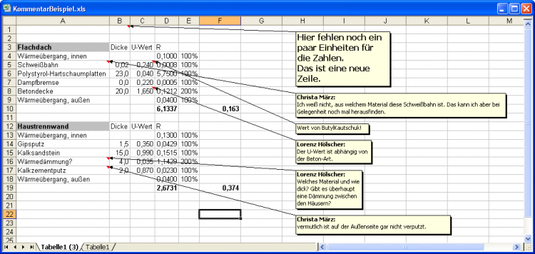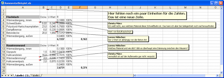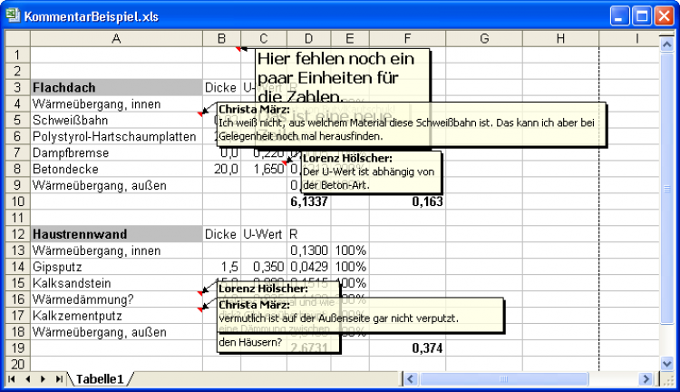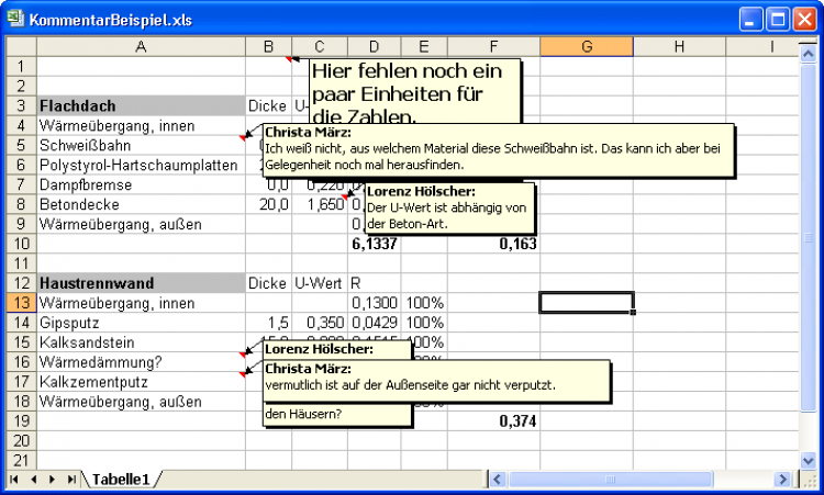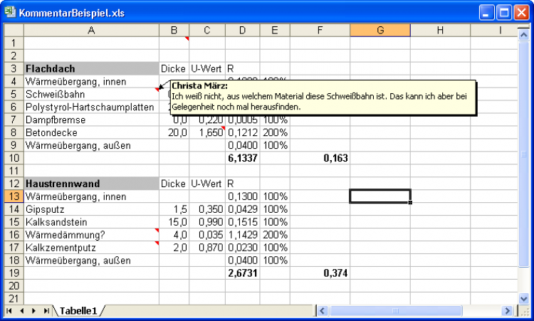 Für diese Kommentare habe ich ein Beispiel gewählt, welches oft sehr erklärungsbedürftig ist: die Berechnung des Wärmedurchgangs von Bauteilen. Dabei geht es hier natürlich nicht um die Formeln selbst, sondern lediglich um die vielen Kommentare darin. Die Kommentare im folgenden Bild erkennen Sie Excel-typisch an den kleinen roten Dreiecken rechts oben in der jeweiligen Zelle. Ein Kommentar wird hier schon angezeigt, weil der Mauszeiger über der Zelle ruht: