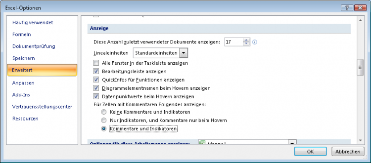 Normalerweise sehen Sie in Excel nur maximal einen Kommentar, nämlich denjenigen, über dessen Zelle sich der Mauszeiger befindet. Mit einer Änderung der Optionen (bis Excel XP: Extras/Optionen/Ansicht "Kommentare und Indikatoren", ab Excel 2007 im Office-Menü bei den Optionen in der Kategorie Erweitert) ist es möglich, alle Kommentare gleichzeitig sichtbar zu machen.