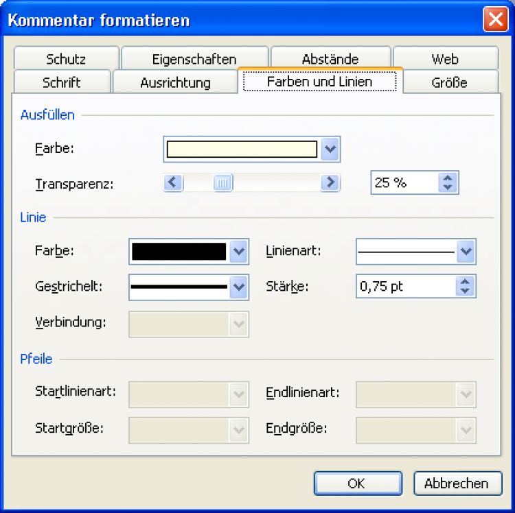 Ein kleines bisschen ließe es sich verbessern, indem die Kommentare teilweise durchsichtig gemacht werden. Dazu markieren Sie einen Kommentar und machen entweder einen Doppelklick auf seinen Rand oder nutzen das Menü Format/Kommentar, um den zugehörigen Dialog anzuzeigen: