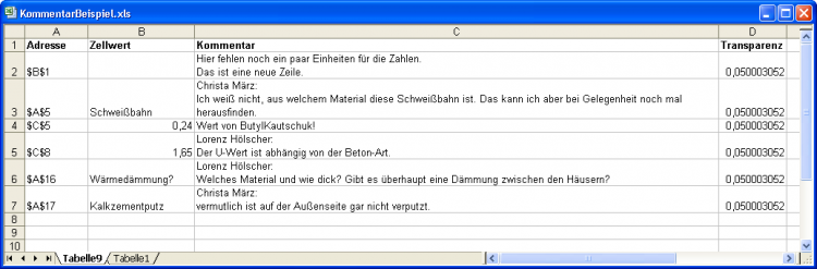 Nur für die bessere Lesbarkeit schreibt der Code zuerst eine fett formatierte Titelzeile in das neue Blatt. Dann werden alle Kommentare durchlaufen und deren Inhalte zeilenweise kopiert. Nach ein paar manuell angepassten Spaltenbreiten und Zeilenhöhen präsentiert sich das Ergebnis so: